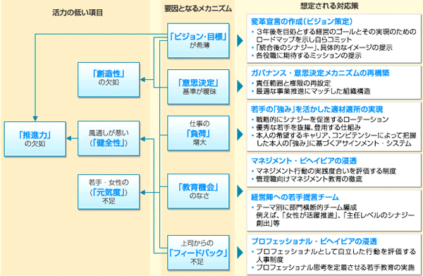 年齢階層別の活性度を見ると、40~50歳代の活力が飛び抜けて高い。それに比べて20~30歳代の活力(特に元気度、自立度)が相対的に低い。統合前後の2年間で業務の統合や標準化、基盤強化に奔走してきた実務部隊としての若手に疲弊感が表れている。今後ますますこれら中堅が積極的に動き、海外事業や新領域を切り開いていく必要があるため、この分析結果は将来への大きな不安材料である。