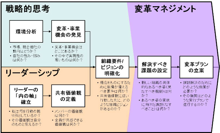 リーダーシップの視点からの内発的なビジョンや変革の発想と、分析的な思考による経営戦略立案の考え方を組み合わせて、意志と論理の両方を備えたビジネスプランを作成します。